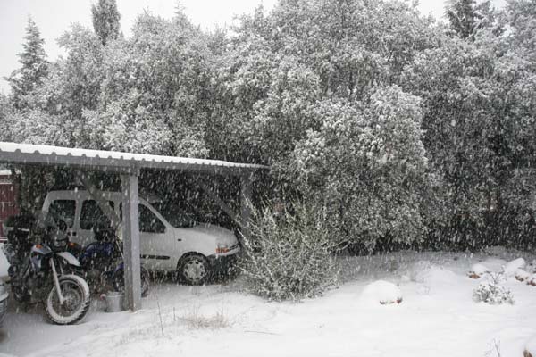 3.- Luego le puse las cadenas de coche a la BMW, muy fácil. Pero me fue imposible controlar la moto dentro de la parcela, así que no me atreví a sacarla a la calle. Demasiado peso en parado y a la mínima tiende a irse al suelo. Acabé agotado y sudando como un pollo para llevarla de nuevo a su sitio. Quizás una vez lanzada se pueda rodar con ella, pero los giros lentos con 15cm de nieve son un martirio.